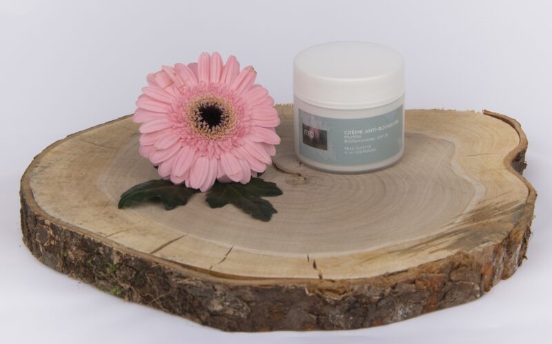 Crème anti rougeur : Composée de myrtille, bioflavonoïde, allantoïne et d’un indice de protection SPF15, elle apaise et atténue les sensations de rougeur et de chaleur provoquées par des agents extérieurs sur les peaux sensibles et sujettes à la couperose. Elle défend la peau du stress oxydatif, des changements de température et rayonnements UVA et UVB. A appliquer le matin sur le visage et le cou.