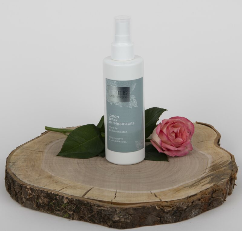 Lotion spray anti-rougeur : Composée de troxérutine, extrait de myrtille, allantoïne, elle apaise la peau sensible, fragile, sujette à la couperose. Elle est idéale pour apaiser la peau rougie par des agents extérieurs (variations de température, vent, soleil, transpiration) et mécaniques (rasage, épilation), pour fixer le maquillage et rafraichir la peau en été, après une activité sportive. A appliquer à l’aide d’un coton ou à vaporiser directement sur le visage et le corps.